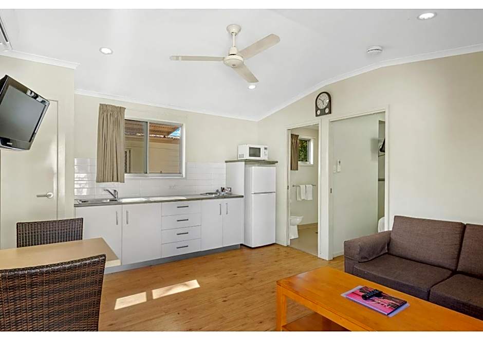 Open-plan design with private bathroom, sofa, TV, kitchenette, dining area, and veranda with outside seating.